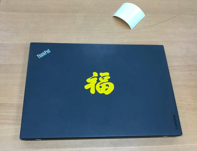 7. I cut a piece of "transfer tape" and pasted over my vinyl cut-out to transfer my artwork to the cover of my Lenovo Thinkpad notebook.