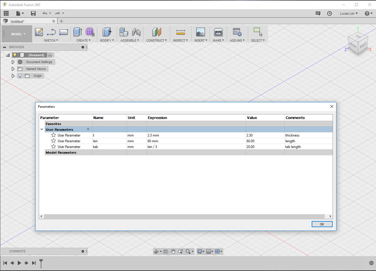 Create 'User Parameters' for thickness of each side: 60mm, length of each tab: 20mm and thickness of material: 2.5mm.