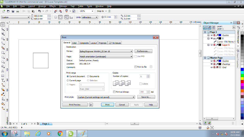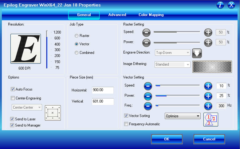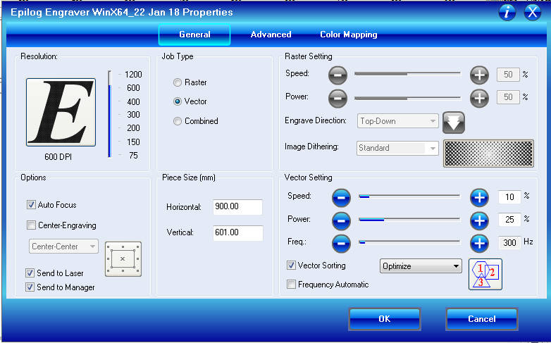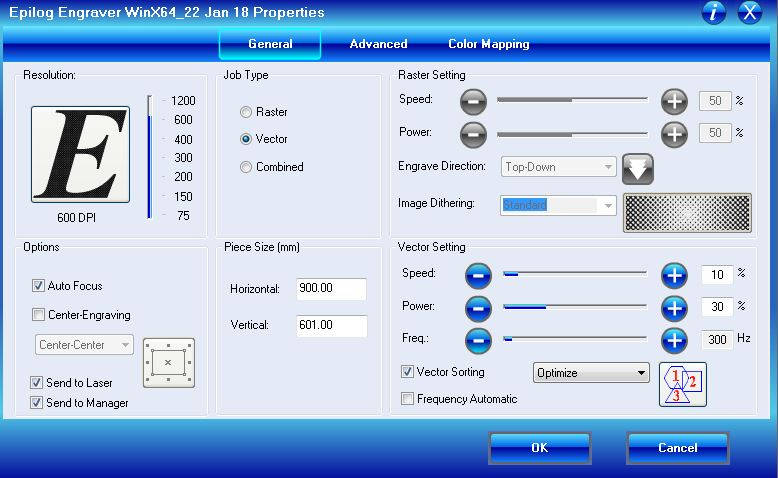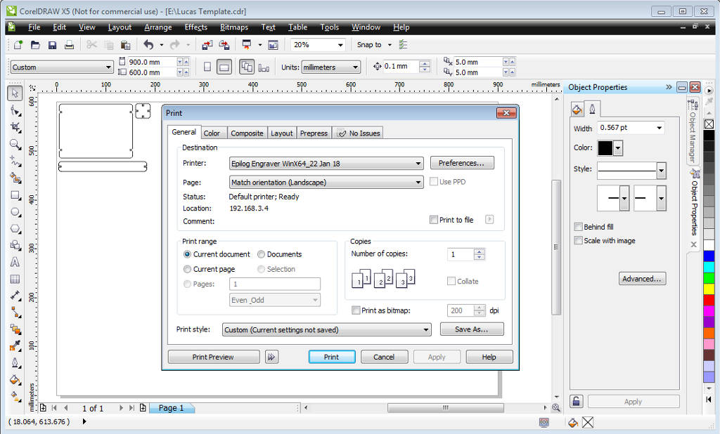 The Epilog dashboard printer driver has been installed on a PC connected with the Epilog laser cutter. The operation is very user-friendly just like sending a print job to a normal printer. The software use was Corel Draw.