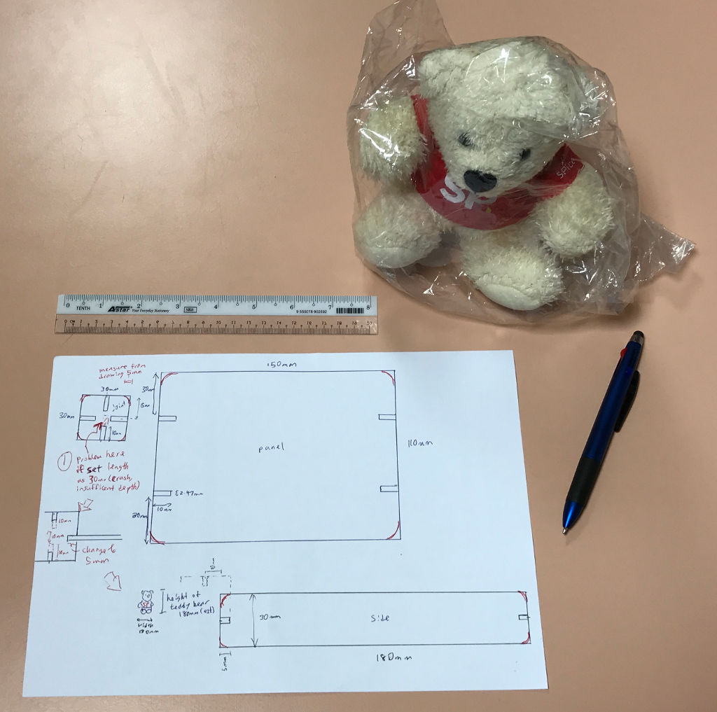 I started stetcing out my idea and initial design on a piece of paper. Drawing out the parts with the measurement taken using a ruler (on a scale of 1:1) allows me to visualise how the final product will be like and make any changes/corrections at an early stage. Changes/corrections were marked out using red colour pen to indicate my changes helps for easy reading.