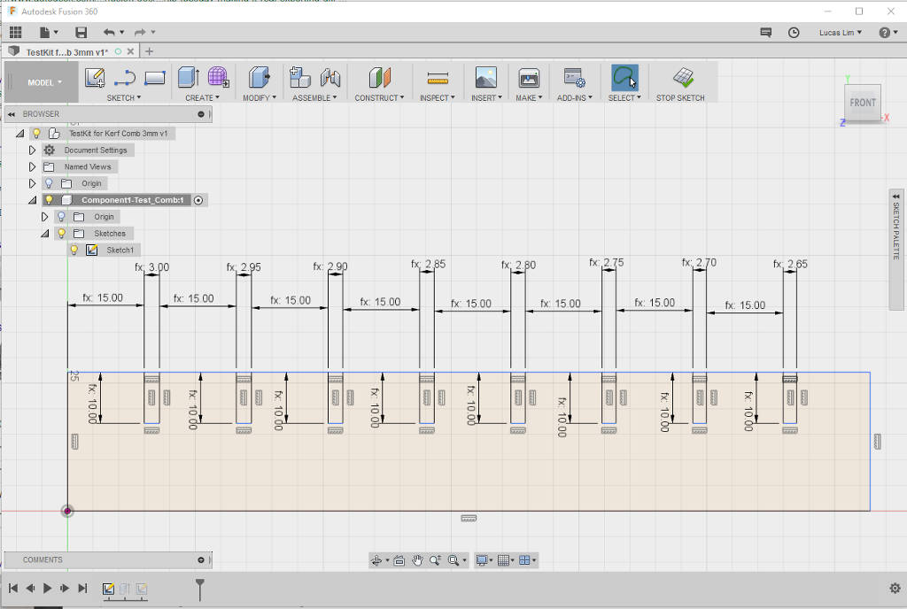 The thickness of the MDF hardboard used is 3mm. I drawn out a simple parametric test comb with a number of 'slots' of reducing measurements for each slot. I had drawn the test comb out using Fusion 360 instead of Corel Draw software on the laser cutter computer, which doesn't support parametric modelling.