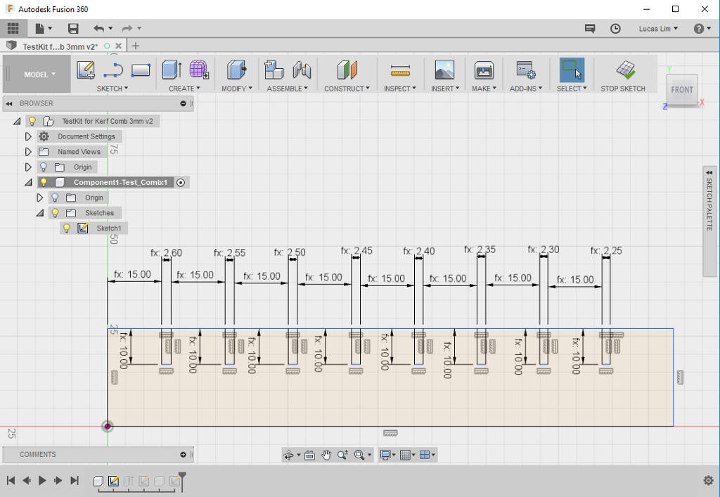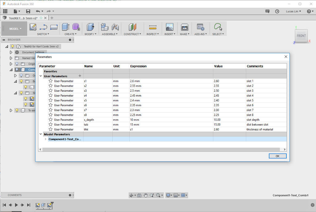 - Parametric Test Comb for testing kerf, in Fusion 360