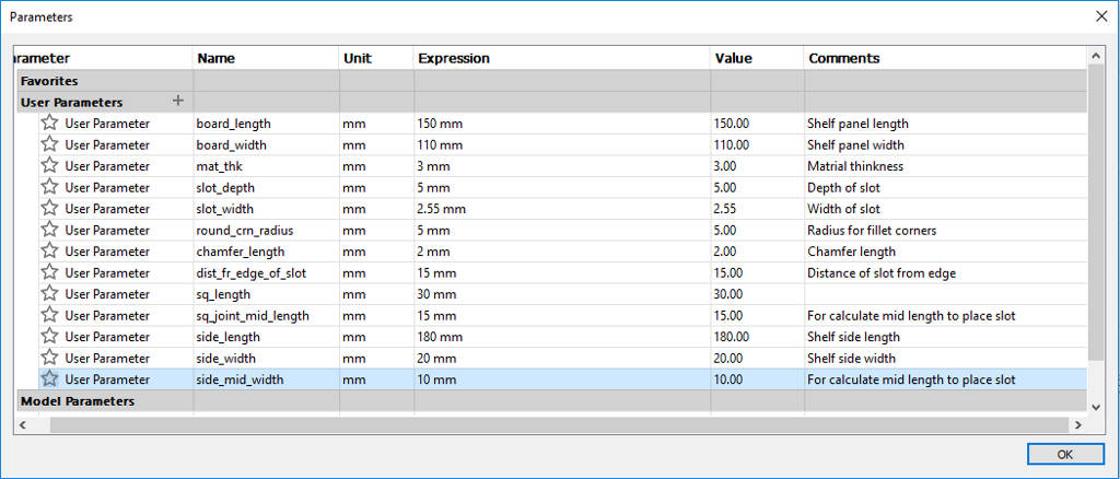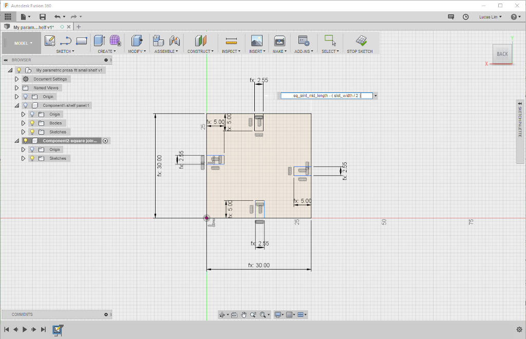 I am new to using Fusion 360, during the deisgn of my square joint, I had wondered on how to make the placement of all my slots dynamic. The slots are to be positioned at the mid of the length of each side of the square joint. Solution : I had created a formula, sq_joint_mid_length - (slot_width/2) which will place the slot at the mid and is dynamic. Fusion 360 does not seem to allow nested or complex formula, so my value for sq_joint_mid_length is manually calculated and entered into the pararmetric screen.