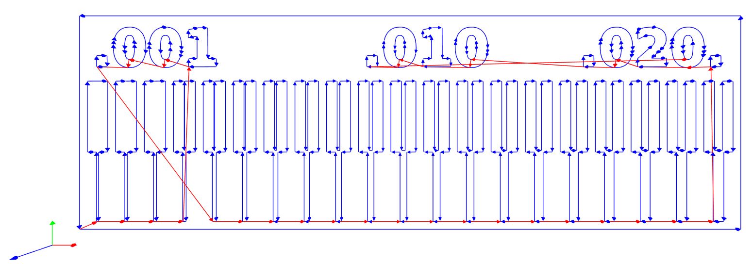 The line test will print traces from 1 mil to 20 mils and used to test the capability of the cutting tool as well as settings. The design is divided into three sections, a few traces under 1 mil, then a few traces under 10 mils and a few traces under 20 mils. 1 mil is equal to a thousandth of an inch (0.001 inch).