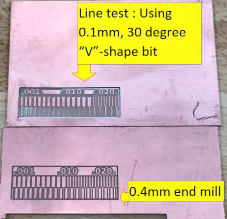 The result shown that using a 0.4mm end mill produce better cutting than using a 0.1mm V bit ("V"-shape bit at 30 degree angle). PS: The 0.4mm end mill linetest was fabricated by Mr Steven, our local Fab Lab instructor.