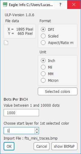 8. Select "inch" as the unit and set the "Dots per inches" to 1000dpi as this resolution was provided in the class site. Click "OK" and run the import script. PS: If the resolution is not provided, you can get the reolution by using GIMP-> Image Property feature, or import the PNG file into mobs. Type "1" in the "choose start layer for 1st select colour" box and this will import the traces onto EAGLE "Layer 1 - Top" which is the (top etching) layer.