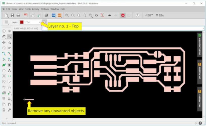 9. Visually check the FabTinyISP design and remove any unnecessay text/objects from the (eg. at bottom-left corner) of the design.