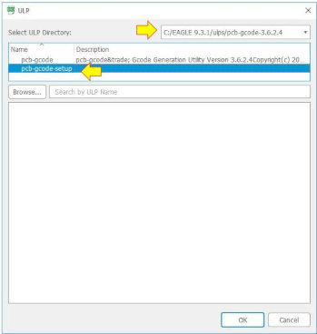 17. At EAGEL Broad Design -> Go to Main Menu -> File -> Select the pcb-gcode directory -> select "pcb-gcode-setup.ulp" and run the user add-in script