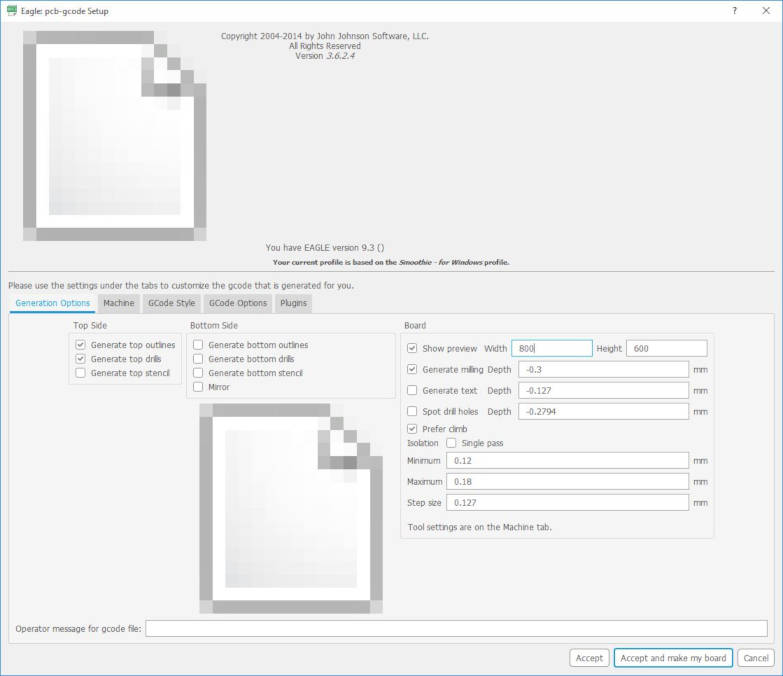 15. I had downloaded the "pcb-gcode" plugin for EAGLE from https://github.com/febtop/pcb-gcode to convert my EAGLE board design into gcode. I extracted the files into a newly created folder called "ulps" inside EAGLE software folder Eg. "C:\EAGLE 9.3.1\ulps\pcb-gcode-3.6.2.4", instead of extracting to the ulps inside the default "Users\My Documents\eagle\ulps" folder.
