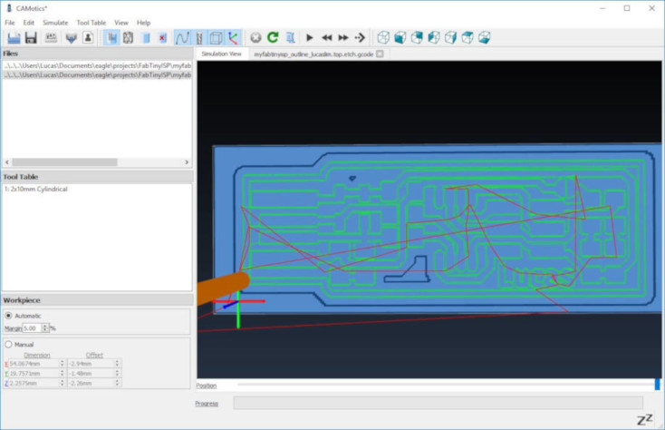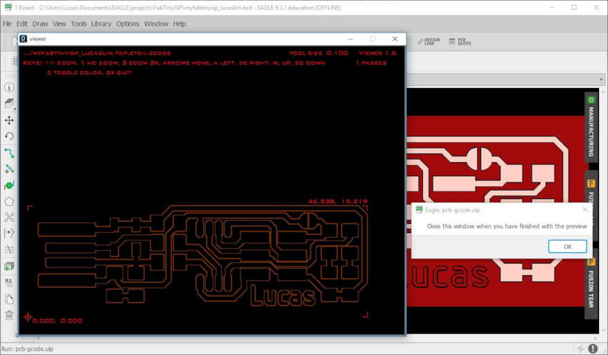 20. The gcode file is saved in the default C:\Users\{username}\Document\eagle\{myproject} folder (example "C:\Users\Lucas\Documents\eagle\projects\FabTinyISP"). Located the file "myfabtinyisp_lucaslim.top.etch.gcode"" and copied to a thumbdrive to be loaded on the PC connected to the STEPCRAFT CNC milling machine (router).