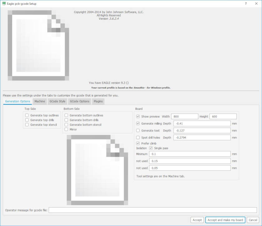 18. At the pcb-gcode ulp window, click the "Machine tab" to view the machine options and set the units to "millimeters", which is the standard measure format in Singapore. follow by adjusting the settings. Then I went to the first screen which is the “Generation tab“ and configure the setting. I selected “single pass“. When everything is ok, I clicked “Accepted and make my board“ to generate the gcode file for milling.
