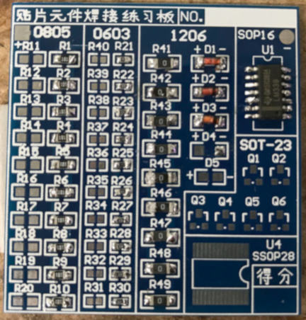 My instructor passed to me a soldering practicing kit to start practising the soldering of various type of SMDs (surface-mount devices) components; starting practising on the "1206" components, then to "0805", then to "0603" and the rest. "1206" refer to their package/size being 0.12 inch x 0.06 inch.