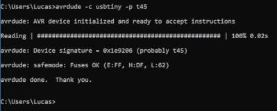 8. To make sure both avrdude and my FabISP are connected correctly and able to talk to each other. I typed in "avrdude -c usbtiny -p t45" to check.