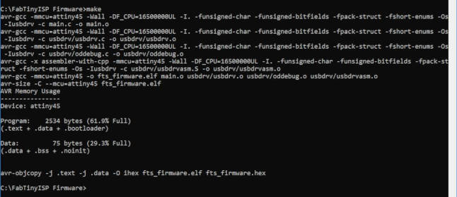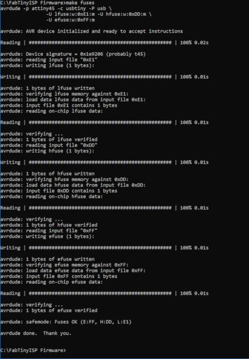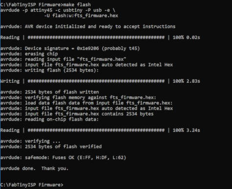 13. I ran the command "make fuses" to programs the fuse bits on the target chip (FabTinyISP)
