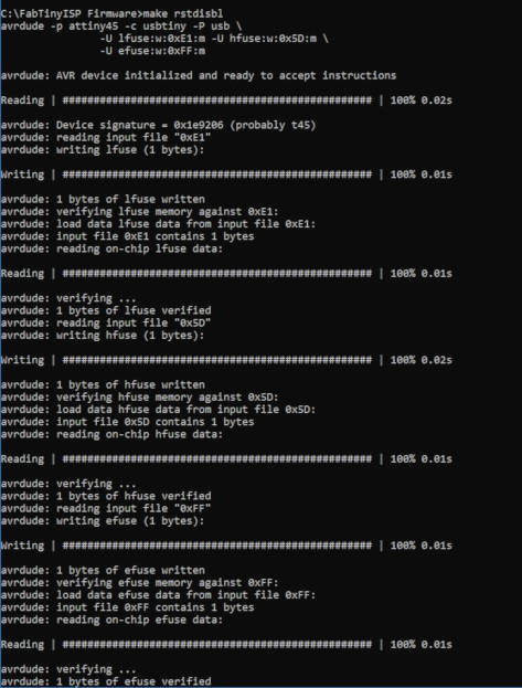 14. I ran the command "make rstdisbl" to blows the reset fuse on the target chip (FabTinyISP).