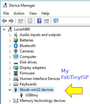 15. To make sure that I had programmed my FabISP. I unplugged the other FabISP Programmer and plugged my FabTinyISP to my notebook. From Windows "Device Manager", I saw that my FabTinyISP was recognized by my computer.