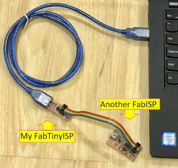 7. I connected my FabTinyISP to another (working) FabISP borrowed from my Fab Lab instructor. Refer to Brian's board design, ensure the cable ribbon is correctly connected, eg. connect pin-1 of FabISP to the pin-1 of FabTinyISP. Then I connect to my notebook. The Windows OS will detect the usb FabISP programmer and list the device in the "Device Manager" screen in Windows Control Panel.