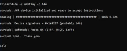 Syntax : avrdude -c {programmer : eg. usbtiny} -p {AVR chip on target board : eg. t44}