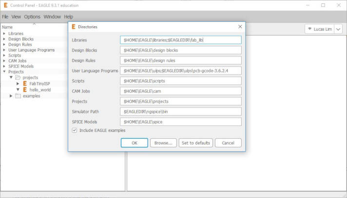 3. At EAGLE Control Panel, go to Main Menu -> "Options" -> "Directories", add in the fab lab library directory name ";$EAGLEDIR\fab_lib" behind the default EAGLE library path.