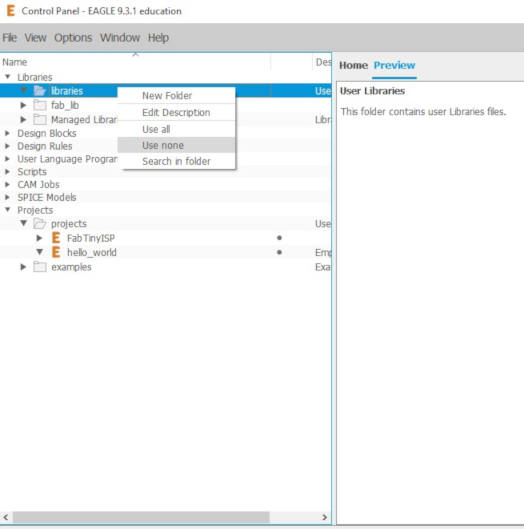4. I am not using the default EAGLE library as EAGLE's thousands of library files can be overwhelming, or more than I ever need, so I hiden them for the time being. I went to EAGLE Control Panel, at the left side panel, under EAGLE "libraries" category, select EAGLE default library “Libraries”, right-mouse-click and select "Use none"