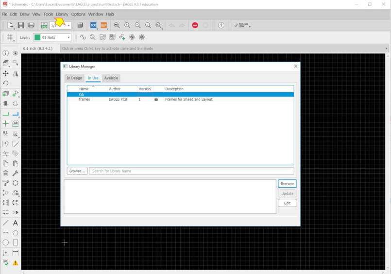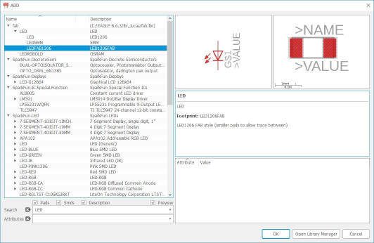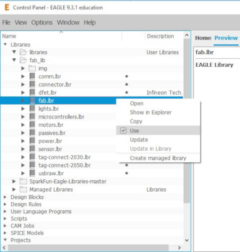 6. I selected "fab.lbr", right-mouse-click and select "Use". A big green dot next to the library indicate that it is in use. You could also turn-on other libraries, like "frame.lbr" from EAGLE, or libraries from SparkFun, etc