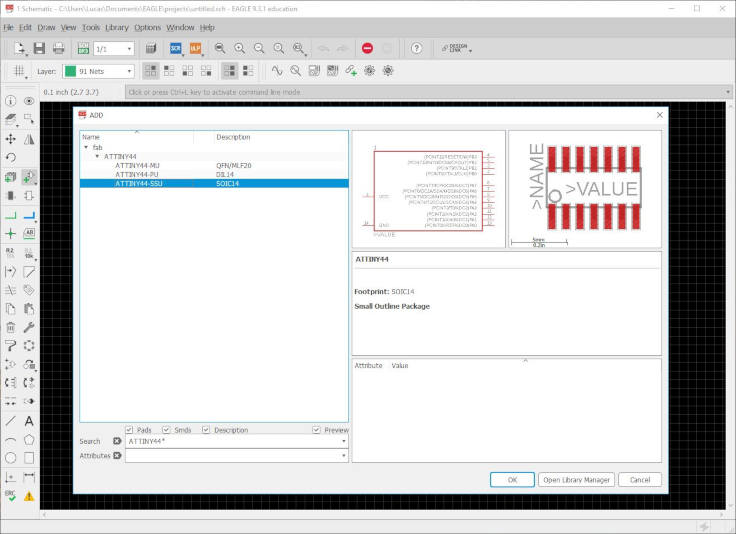 Type the "add" command in EAGLE's command box at the top. At the Add component windows, searched for the "ATTiny44" microcontroller in the Fab Lab ibrary, and add to the schematic.