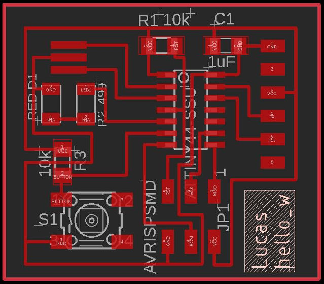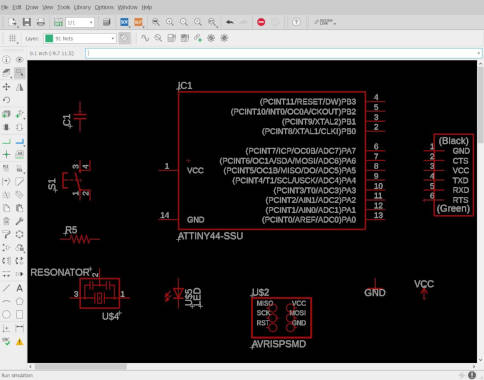 Note : I tried to position the components accordinly to the way that I think I would place the physical components on the actual 'hello world board' with FTDI connector on the right, ISP 6-pin connect at the bottom. LED and Switch (S1) on the left. In future, another way might be for me to place on the 'input' devices on the left and 'output' devices on the right.