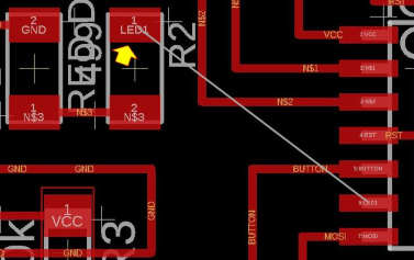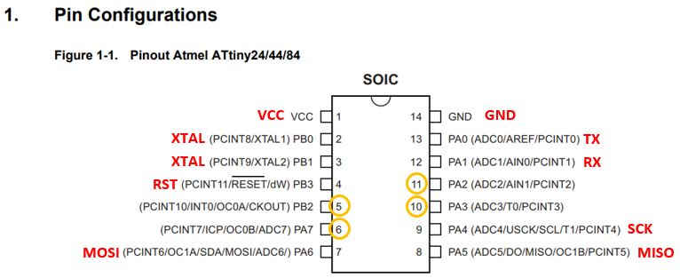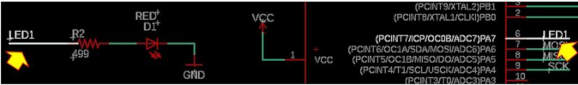 There are a few open pins (or floating pins) available on the ATTiny44A microcontroller, namely PA2, PA3, PA7 and PB2. Therefore I used the open PB2 to connect to the LED, and the open pin PA7 to connect to the S1 (Switch).