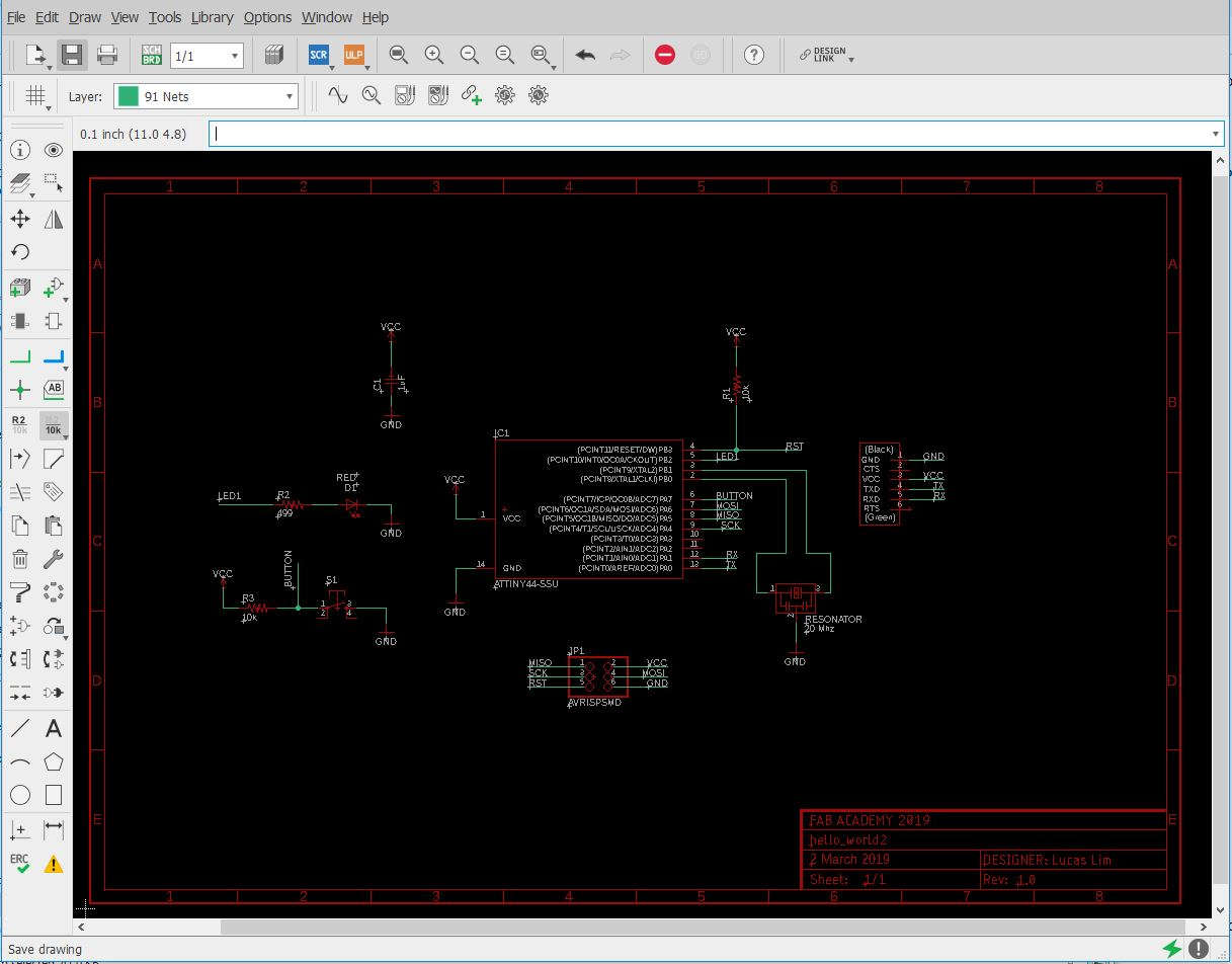 This week assignment involve designing the "hello-world board", which include drawing of the schematic as well as broad diagram, PCB fabrication, stuffing the board and lastly to test the board to see if is working or not. Two components are added, one is the button (switch) which will be used as an "input device" and the other is a LED which represent an "output device".