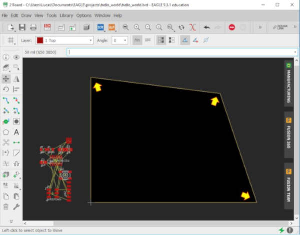 I am using the academic version of Autodesk EAGLE (version 9.3.1) to draw my schematic and board design for my "hello-world board", as EAGLE is free for academic use for up to 3 years, iEAGLE is user friendly, and include an integrated schematic editor and board editor. However, the academic version has a limit on the board size.