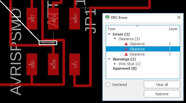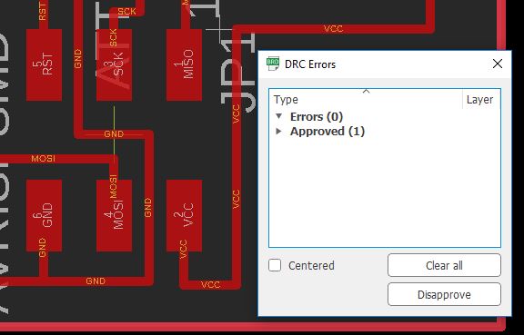 I ran EAGLE DRC (Design Rule Check) tool to check my board against the current set of Design Rules. It is a best practice to make sure that the trace should be wide apart to have some tolerance during the (CNC) machining etching process, like cater for spindle runout.