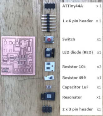 | 1. | IC1 - t44 | ATTiny44 microcontroller (surface mount) | Fab Lib | ATTINY44-SSU | 1 |