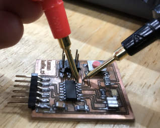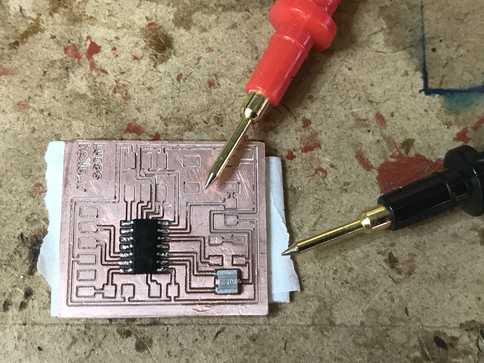 Example place one probe on the pin of the ATTiny44A and the other on the copper track where that particular pin rest.