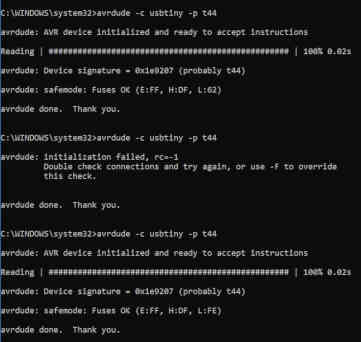 avrdude -c usbtiny -p t44 -P usb -e -U flash:w:hello.ftdi.44.echo.hex