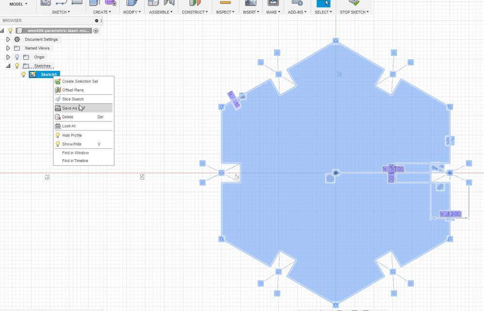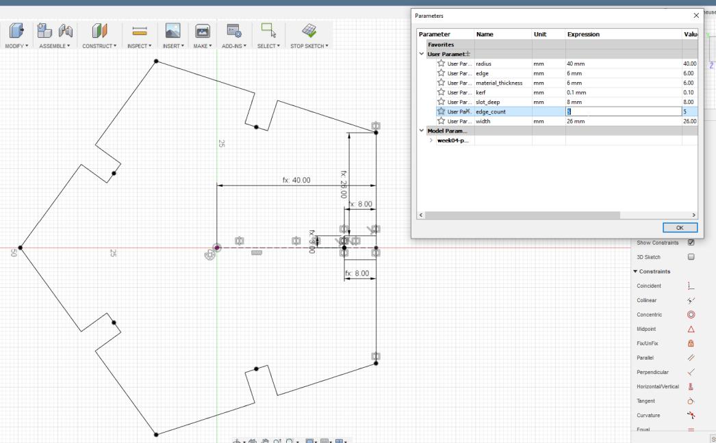 My fusion file with the 3 attempts, each one on a different sketche : week04-parametric-laser-modularv5.f3d