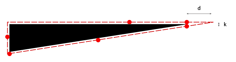 The group from last year used a electron microscope to measure the laser’s kerf, but we wanted to try a different approach. So we tried the set up below. The red dot symbolizes the laser, the dashed line represents the laser’s course and the black triangle the matter leftover after cutting. If the height of the triangle is sufficiently small (4mm) and the other edge very long (300mm), then by measuring the distance d, and with a little help from Thales theorem , we should be able to calculate the kerf (k)!