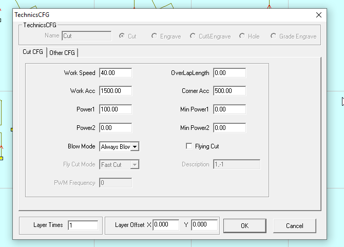 When you double click on the layer on the right side of the screen, a pop-up screen gives mode parameters : speed, accelerations , accelerations in the corner, minimum and maximum power related to acceleration, and if you want to blow some air to push down the flame under the lens.