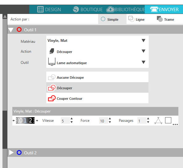 You can select some preset for material or you can go directly to the thickness of the material, here 0.1, the speed is 5 , the strength is 10 and I do only one pass. Previously I select the cutting tool with the auto-blade. And select the cut function.