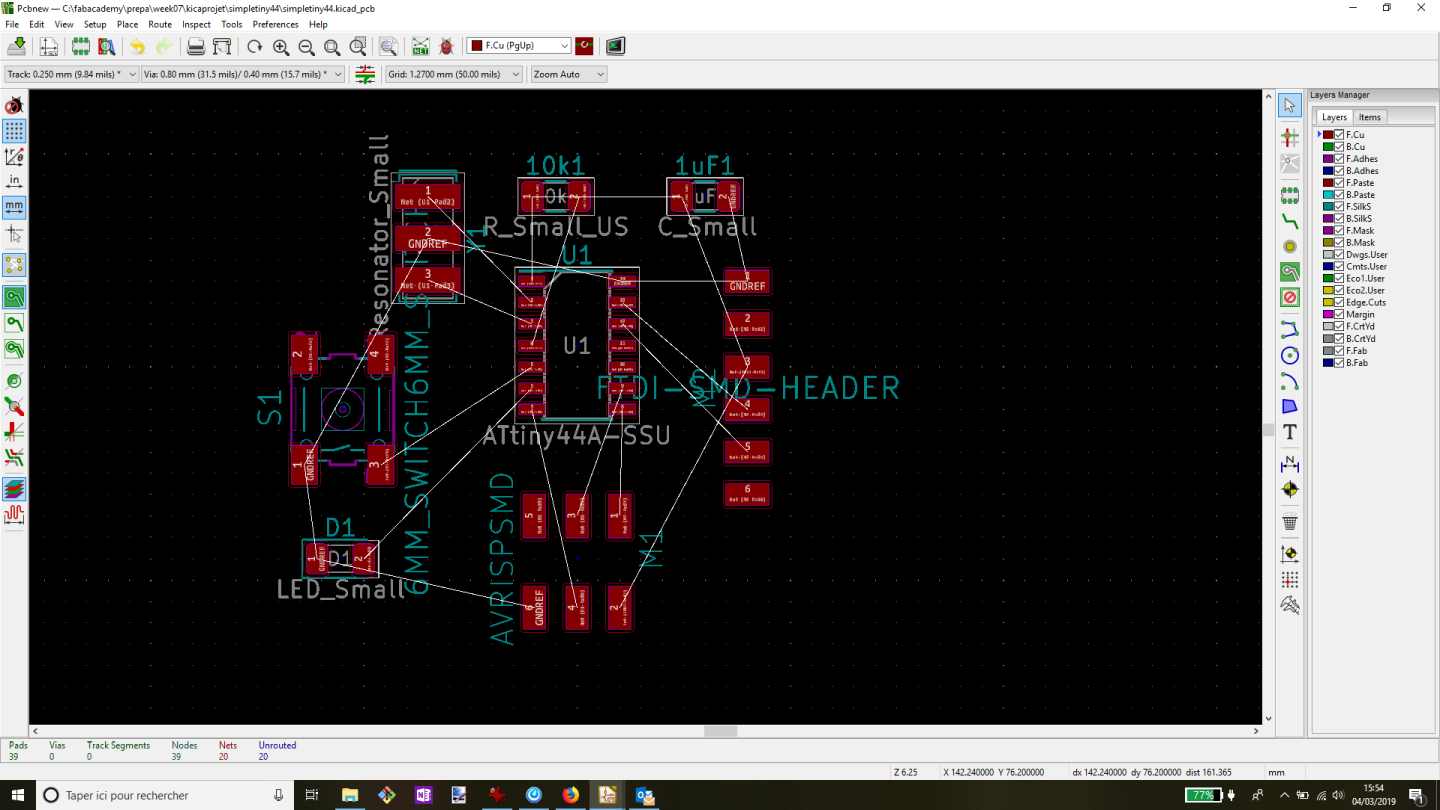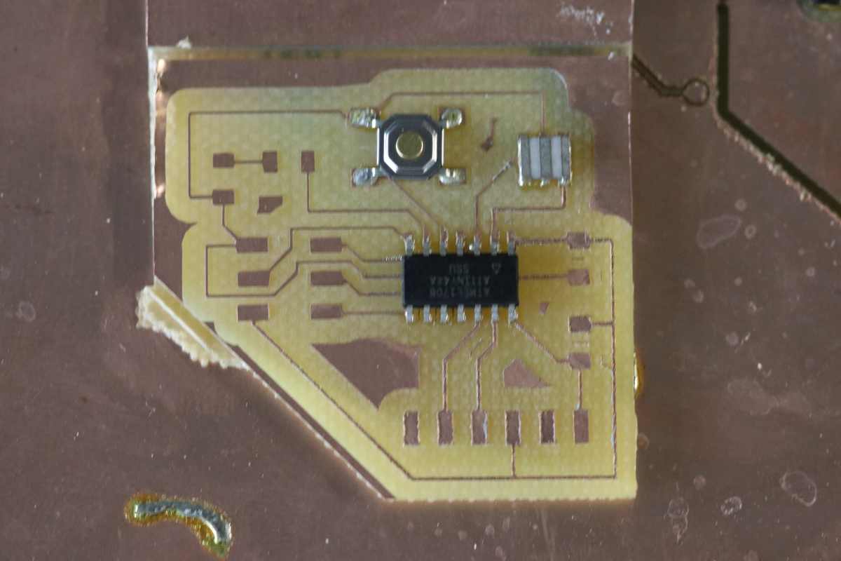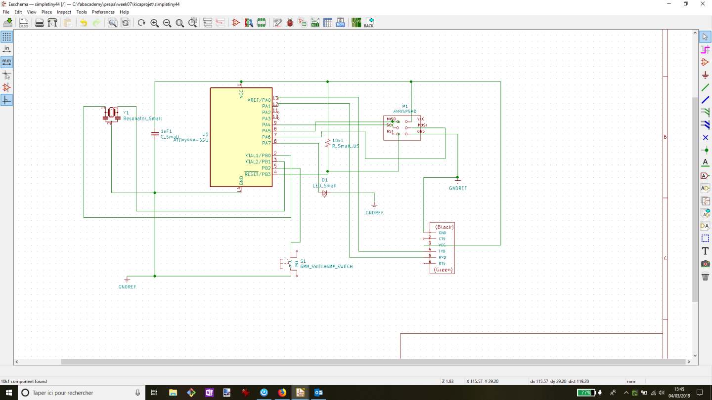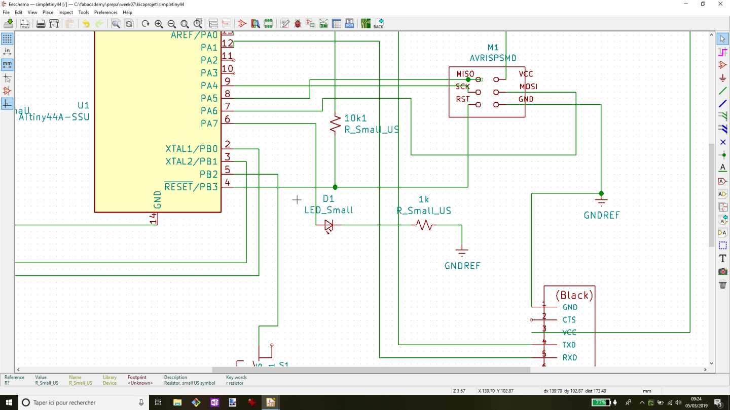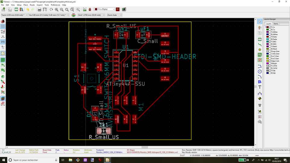 This week I have to design an electronic board with an atTiny44 , a resonator of 20 Mhz some condensator and resistor, a LED and a button, a ISP connector and a FTDI connector. Produce the board by milling, solder all the components, check them. Test and learn several electronics tools : multimeter, oscilloscope. And finally test a small hello program.