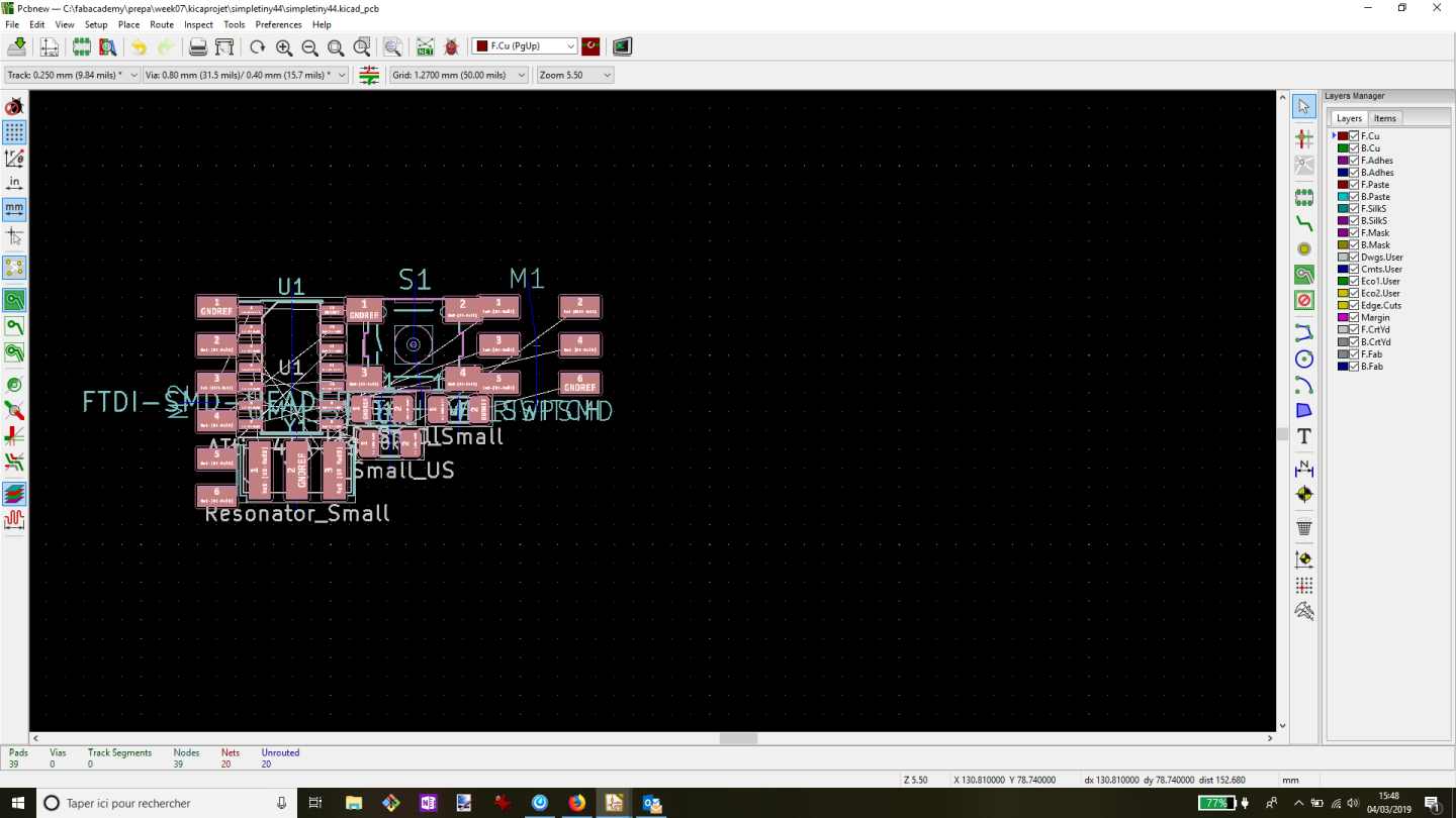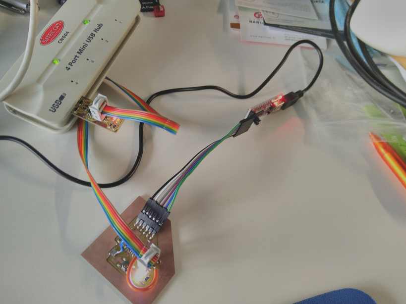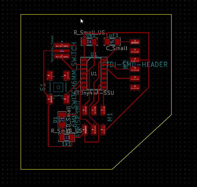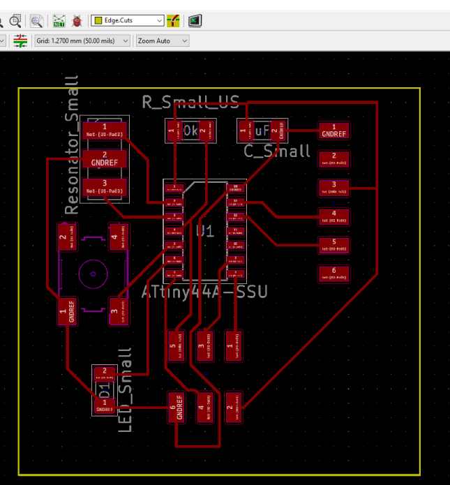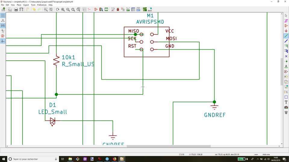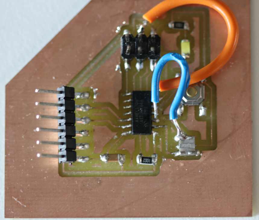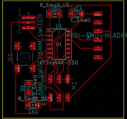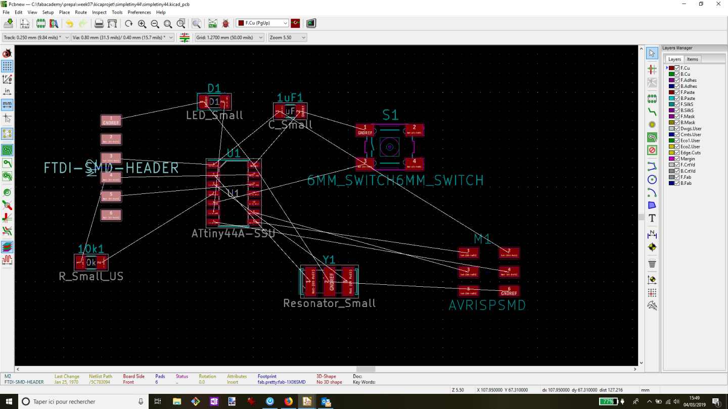 This week I have to design an electronic board with an atTiny44 , a resonator of 20 Mhz some condensator and resistor, a LED and a button, a ISP connector and a FTDI connector. Produce the board by milling, solder all the components, check them. Test and learn several electronics tools : multimeter, oscilloscope. And finally test a small hello program.