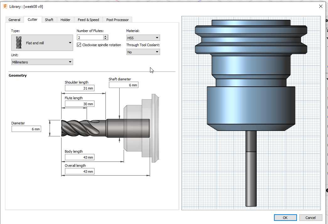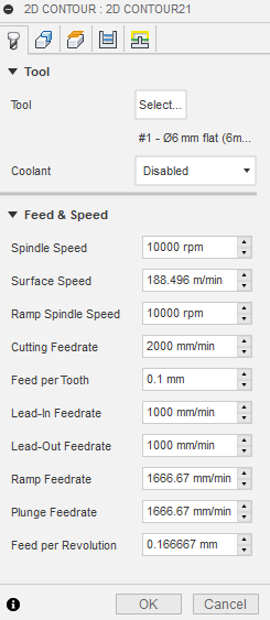 I have previously define the flat-end mill. It has 2 flute , a diameter of 6 mm and I work at a feeding rate of 2000 mm / min.