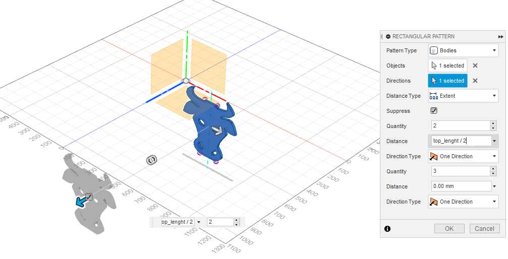I duplicate the element with the linear pattern function with a parametric distance of half the lenght of the top shelf.