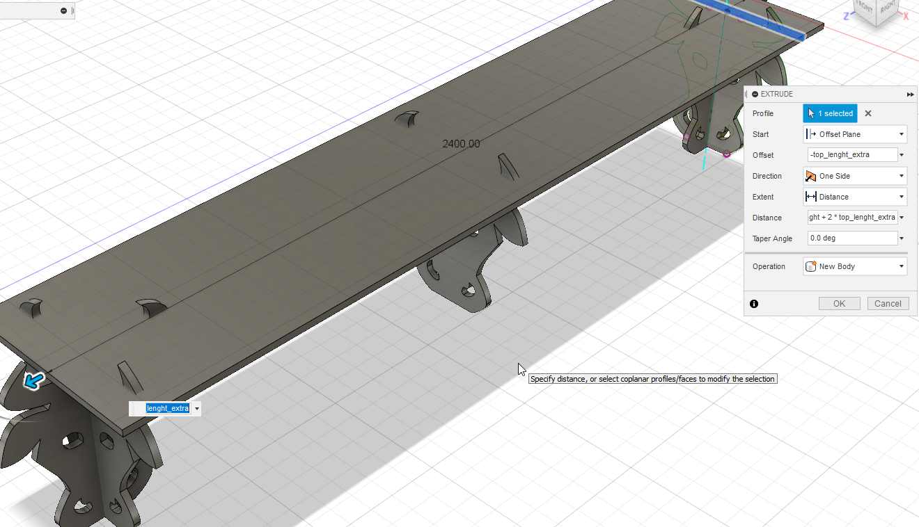 Then I extrude that rectangle with parametric values : the lenght of the top shelf and an extra lenght on both sides.