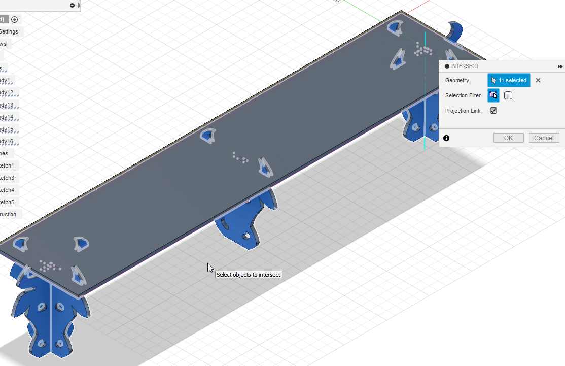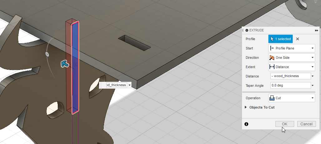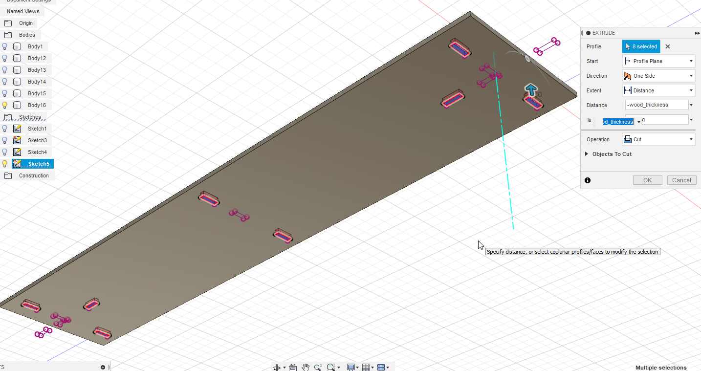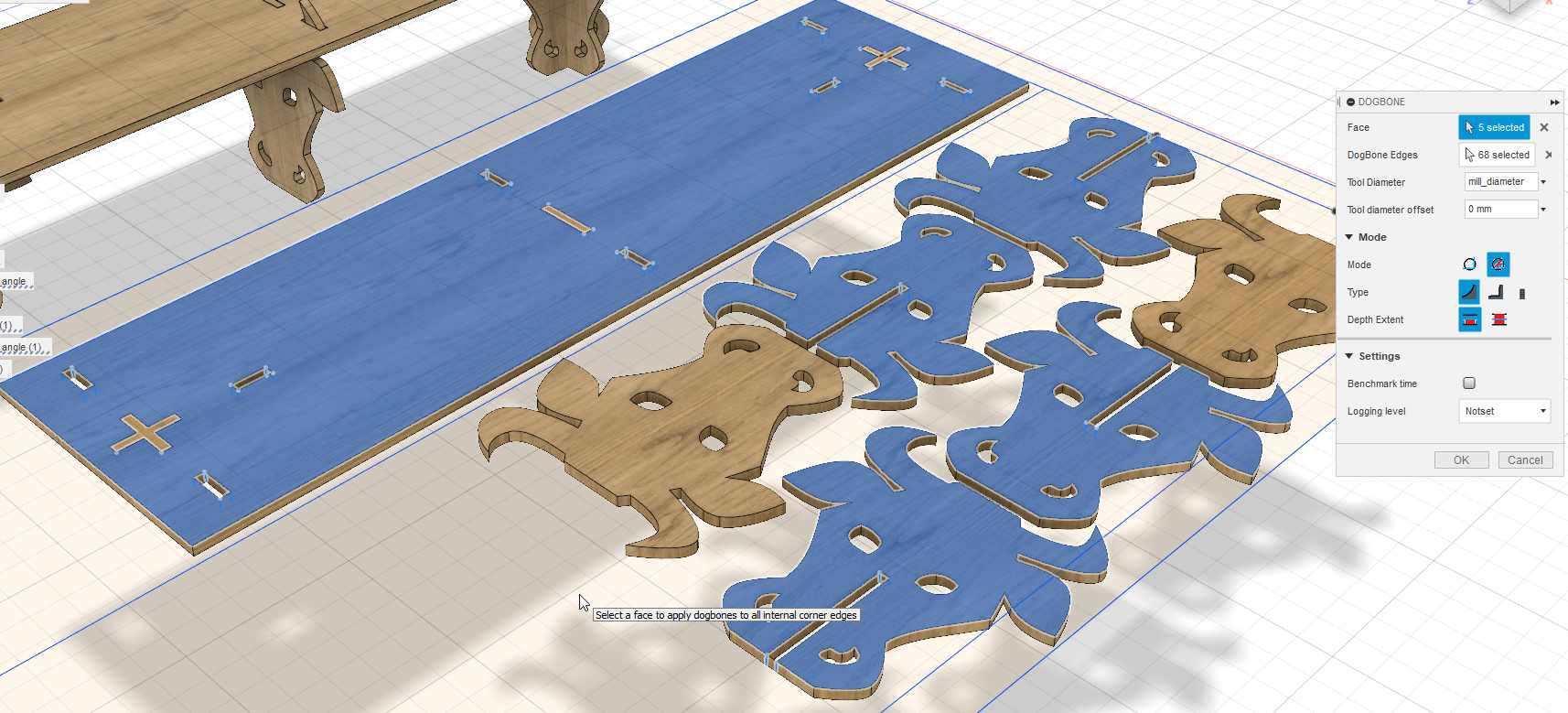 Finally I decide to create some pocket on the top side of the shelf, it’s just in case I need to drill some screws, they’ll be perfectly align with the bottoms parts. I create a projection and cut those volumes.