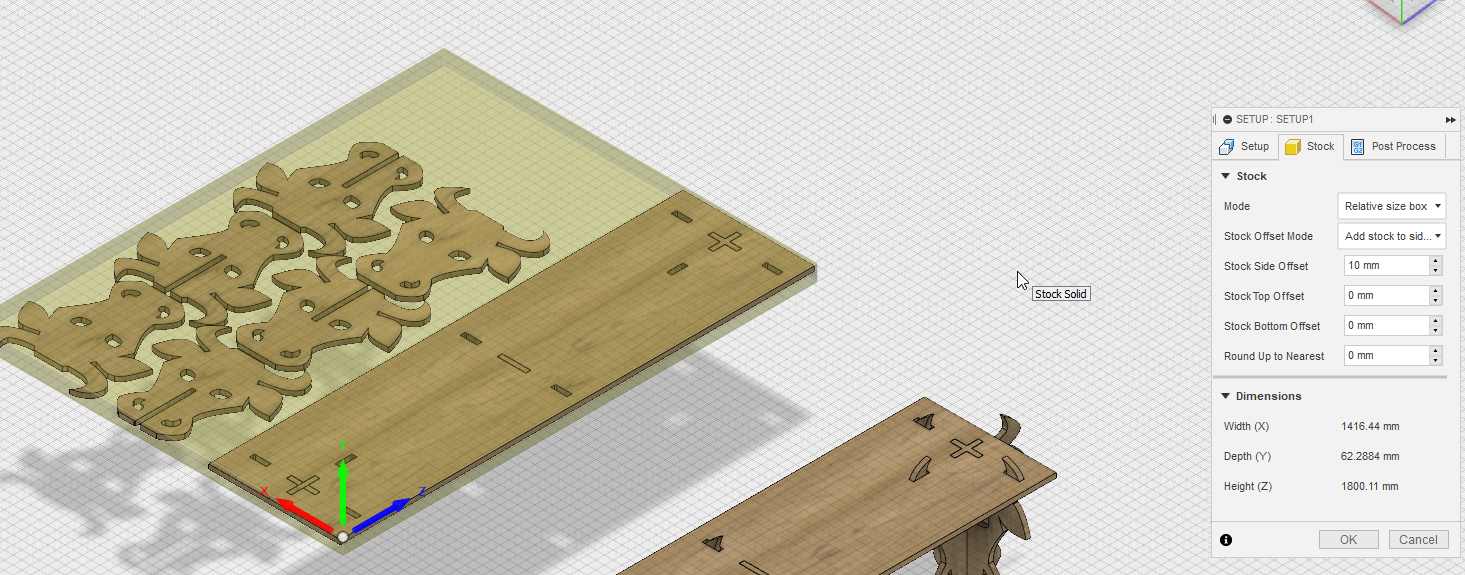 I select the right oriengation. I select the right origin on a stock point. I create the stock material with 10mm of extra space on the sides.