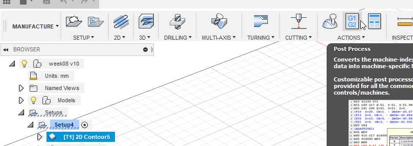 I switch to the CAM module of fusion now called Manufacture.