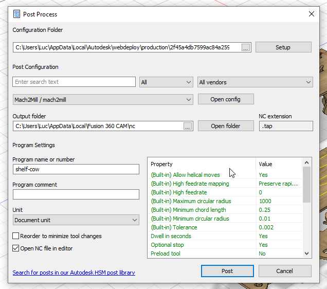 I select the mach2 post-processor. It generates a gcode compatible with my CNC, but I have to do some minor correction. Later I will write a dedicated post-processor.