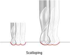 End mills come in a variety of shapes. The most common are flat end mills and ball end mills. Flat end mills will cut flat areas with no scallops. However, they leave a terrace-like scallop on non-flat surfaces. Ball end mills will leave smaller scallops for the same stepover value on sloped surfaces, but they will also leave scallops on flat areas.