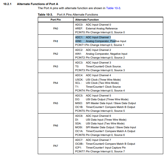 I undestand why the ISP is using the pins PA4 & PA5 , to use the Universal Serial Interface described in 14 , page 117. And more specifically in 19.5 page 163 . But why to use the PA0 & PA1 for the FTDI ? Maybe because they are not any USI pin left. I think I need to use a serial software system to communicate with the FTDI on PA0 & PA1. I don’t get a buffer/register as I would have on PA4 & PA5.