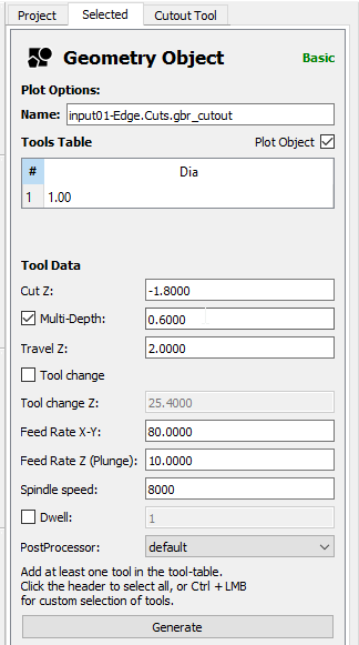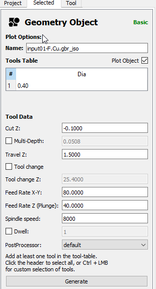 like the tool size : 0.4mm, the depth of the Z cut : -0.1mm. Pay attention the feedrate are in mm/min. The last step is to click on generate.